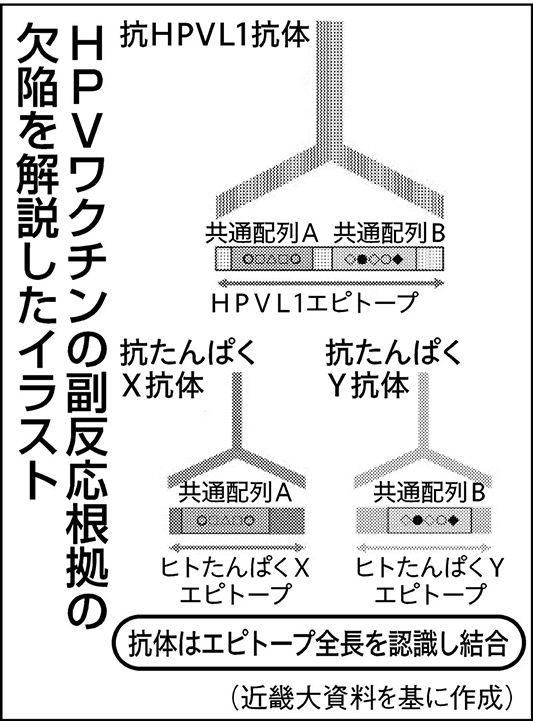 先に述べたように「data」や「base」だけで「database」と理解されないように、「L1タンパク質」=「database」と仮定すると、HPVワクチンは「database」を一塊として認識し抗体を作るのであって、「data」や「base」といった一部分までを認識してまで抗体を作りません。健常人のたんぱく質の中には「data」や「base」といった「database」の一部分があるので、HPVワクチンを接種することで「data」や「base」の一部分に対しても抗体が産生され健常組織を傷害する・・・これが副反応の仮説となっていたのですが、接種してもそれら一部分に対して抗体は産生されないので、この仮説は無理があるということです(専門用語でエピトープとは、抗原蛋白質のうち抗体が結合する部位のことをいいます。模式図のヒトたんぱくXやYエピトープは「data」や「base」にHPV1エピトープは「database」に例えました)。